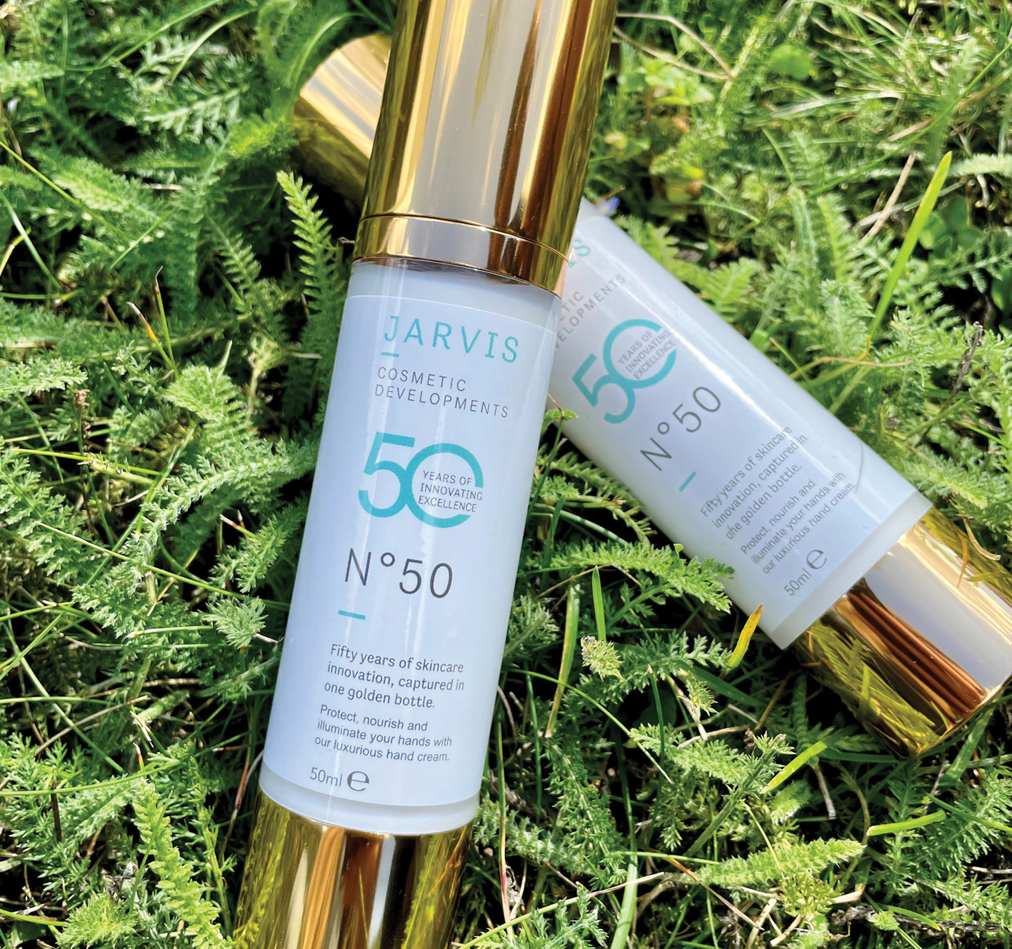 Wanting to thank their clients and professional contacts, Jarvis developed a unique luxury hand cream and commissioned me to create the packaging labels for it. We designed a premium brand label inspired by the iconic Chanel No. 5 aesthetic — with the “5” becoming “50,” celebrating “50 years of skincare innovation, captured in one golden bottle.”